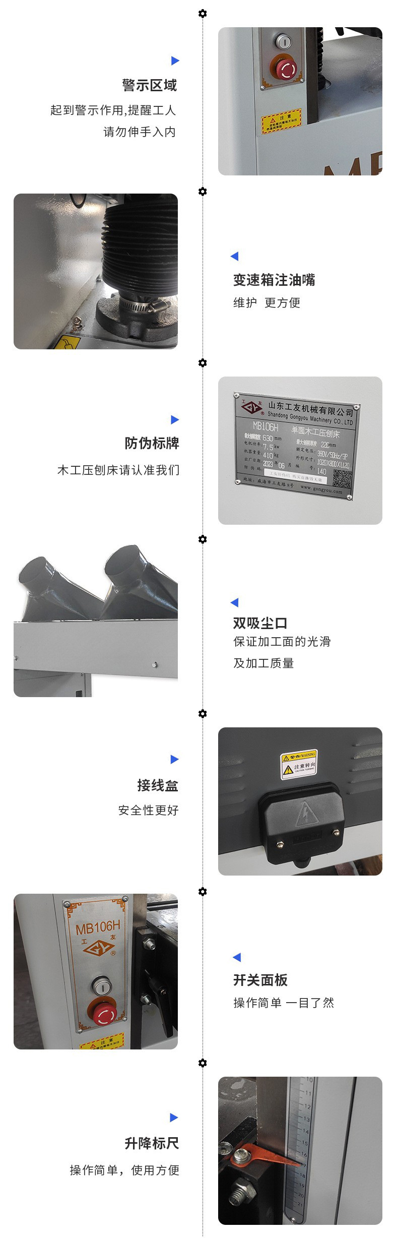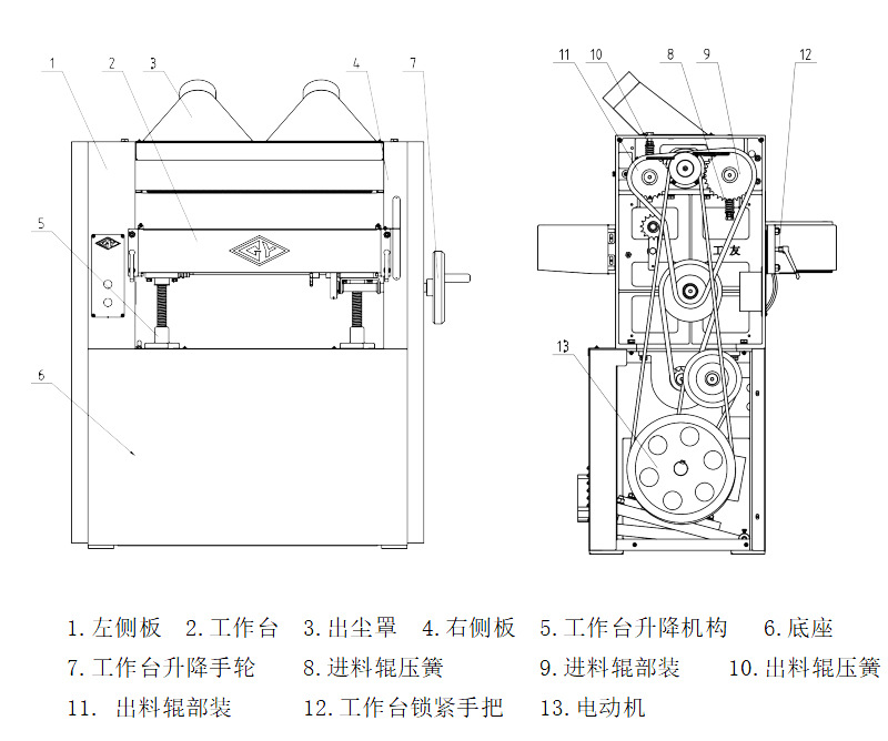 該機(jī)床送料平穩(wěn),前壓輥采用分段活動結(jié)構(gòu),可同時送入厚度相差2毫米以內(nèi)的多塊材料;前后壓料器調(diào)節(jié)方便,可加工薄板;工作臺升降裝置結(jié)構(gòu)合理,操作平穩(wěn)輕便;獨(dú)特的主軸結(jié)構(gòu),保證良好的加工質(zhì)量。該機(jī)具有兩級送料速度,可滿足不同加工工件的要求。